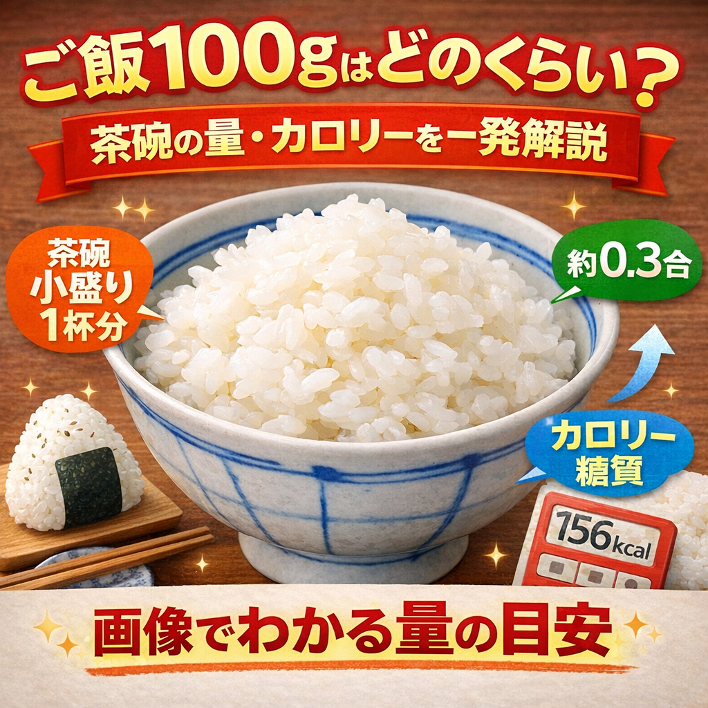 ご飯100gは、一般的なお茶碗で軽めの小盛り1杯程度です。